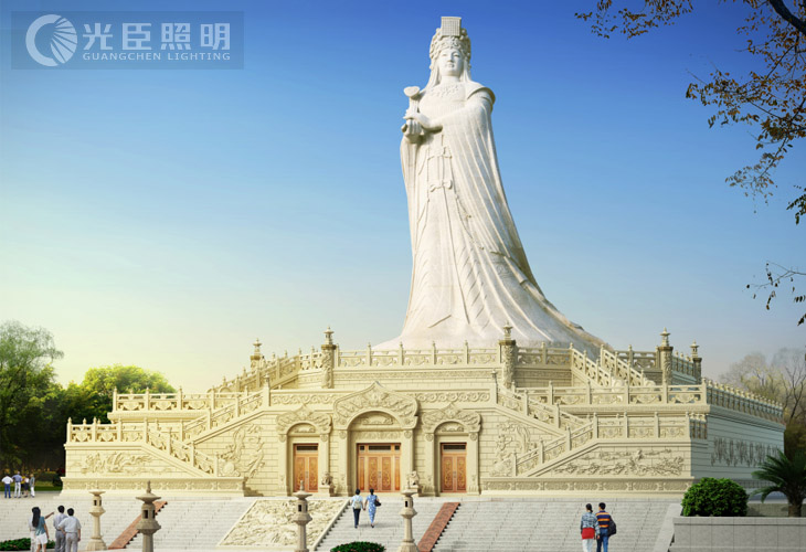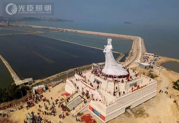 結合參照物體的亮化背景,媽祖像高度約30米左右,實現(xiàn)媽祖石像整體打亮,光臣照明為此定制一款大功率400W投光燈,DMX512金黃外控洗墻燈及LED藍光小射燈作為本次媽祖亮化燈具,在白總與光臣照明的同共努力下,效果呈現(xiàn)與設計方案效果還原度高達99%。