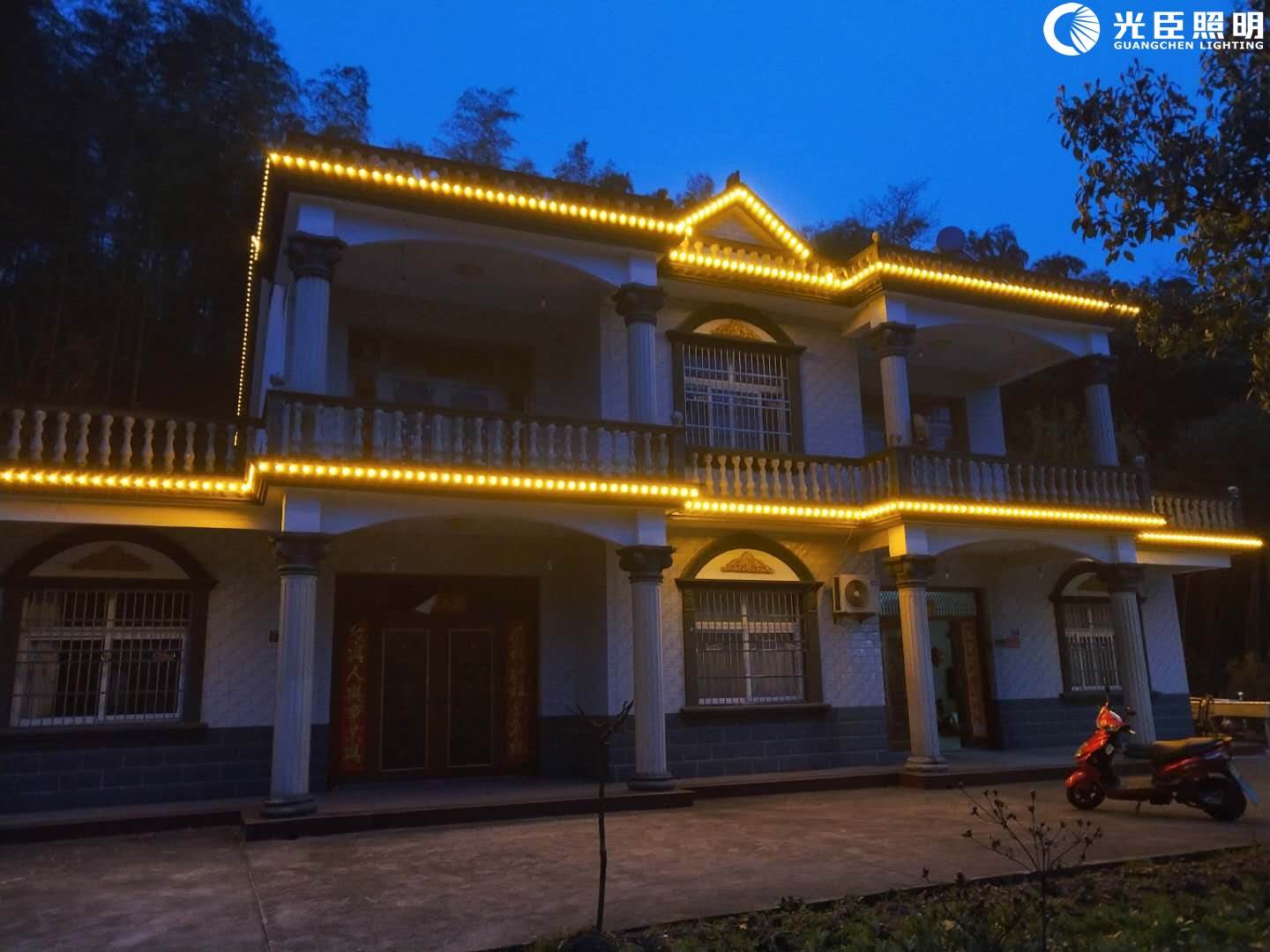 此次的項目是去年合作過一個地產(chǎn)樓盤蔡總自家房子亮化。通過上個項目,蔡總對我們產(chǎn)品質(zhì)量和服務都是豎拇指的。因為這次是鄉(xiāng)村的房子,蔡總那邊表示不要過于花哨,想要那種星星點點的感覺。有了上個項目的磨合溝通,業(yè)務員和蔡總這邊很默契,很快制定了方案,選定光臣直徑3公分點光源圍著樓體走一圈。燈光的色溫和布點位置與建筑形體、色彩和景觀空間完美結(jié)合,形成了極強的高端感受和靜謐氛圍。