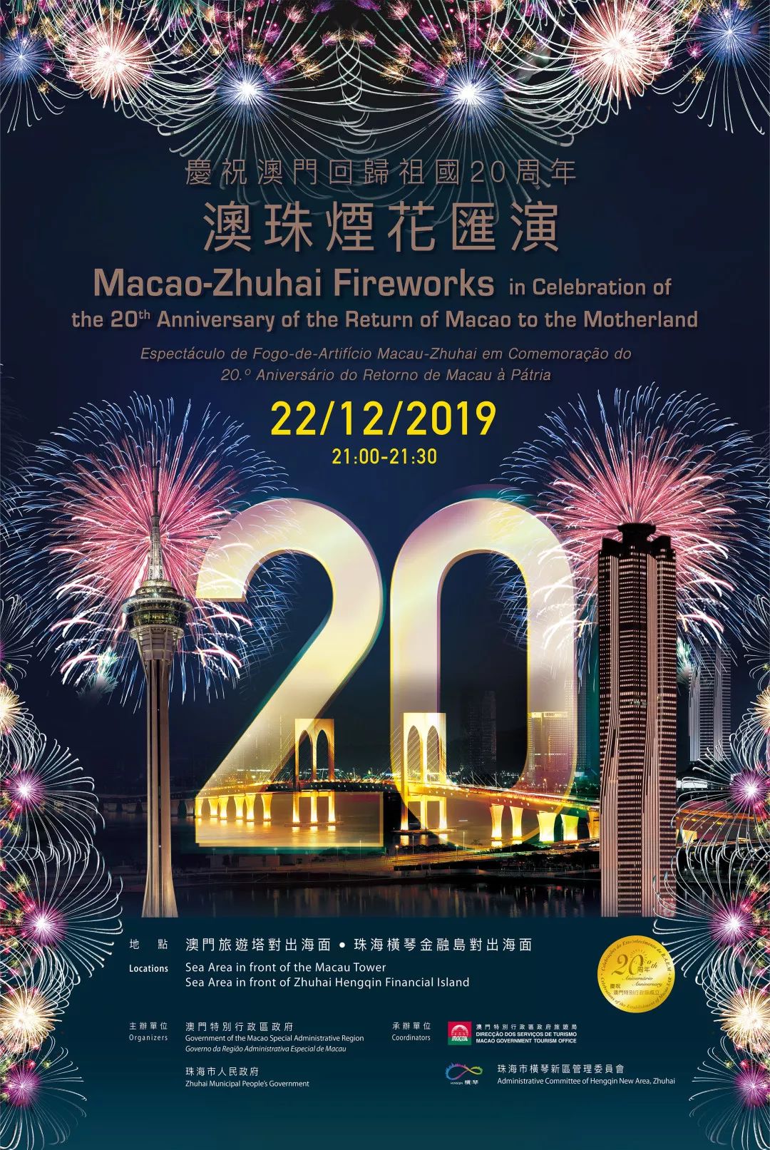 “慶祝澳門(mén)回歸祖國(guó)20周年澳珠煙花匯演”將于12月22日晚上9時(shí),在澳門(mén)旅游塔及珠海橫琴金融島對(duì)出海面舉行。屆時(shí),4艘大泊船及16個(gè)特效燃放平臺(tái)于三十分鐘發(fā)放16萬(wàn)枚煙花,無(wú)人船及無(wú)人機(jī)亦首次參演。一場(chǎng)壯麗璀璨,寓意團(tuán)圓歡慶、美滿繁盛的煙花盛典將隆重登場(chǎng)!