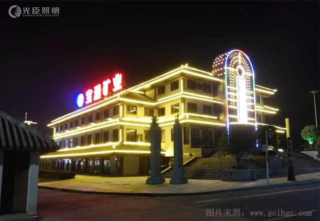 寶源礦業(yè)集團(tuán)是行業(yè)中的標(biāo)桿企業(yè),對(duì)于宏偉的頭門(mén)來(lái)說(shuō)怎能少得了亮化修飾,此次工程選用外控七彩線條燈、120MM七彩漸變LED點(diǎn)光源、以及金黃光的2819線條燈、4048洗墻燈組合完成。