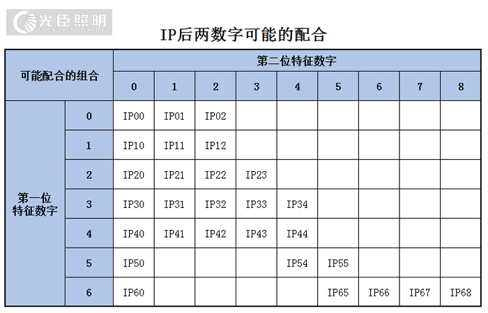 光臣智科同樣沿用國際上采用的字母“IP”(International protection)后面跟兩個(gè)數(shù)字來表示燈具的防塵、防水等級(jí)。前一位數(shù)字表示對(duì)人、固體異物或塵埃的防護(hù)能力,后一位數(shù)字表示對(duì)水的防護(hù)能力,見下圖: