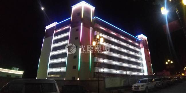 比如西藏地區(qū)樓房以白色紅邊為主,很少用金黃光色溫。近期項(xiàng)目是一個西藏地區(qū)的一個宿舍樓,白墻紅邊的墻身,所以在色溫選擇上用了白光及全彩。本次項(xiàng)目用了白光雙頭壁燈、白光洗墻燈以及全彩外控線條燈,完工亮燈效果符合設(shè)計圖紙,客戶驗(yàn)收完成。