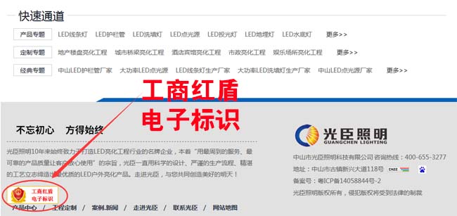 大看可以通過這個標識去了解該公司的資質(zhì),紅盾電子標識一般會安裝在網(wǎng)站的底部位置,這也是您找線條燈廠家的一種標準之一哦,光臣照明從網(wǎng)站建站開始已取得紅盾電子標識,您可以通過官方網(wǎng)站首頁底部查看。